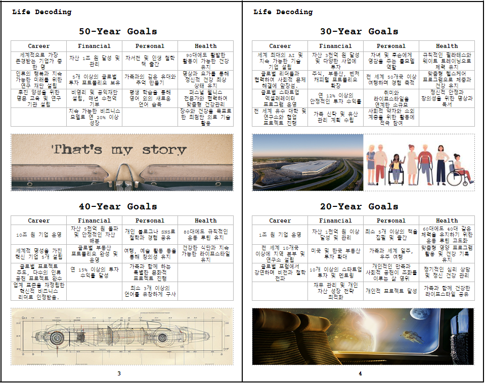 Life Decoding(인생 역설계) 섹션은 단순한 목표 설정 도구가 아니다. 인생을 체계적으로 설계하고, 상상 속의 목표를 현실로 만들어가기 위한 강력한 도구이자 지도이다. 매일 다이어리를 통해 미래의 나와 연결되며, 그 목표를 이루기 위한 오늘을 살아가길 바란다.