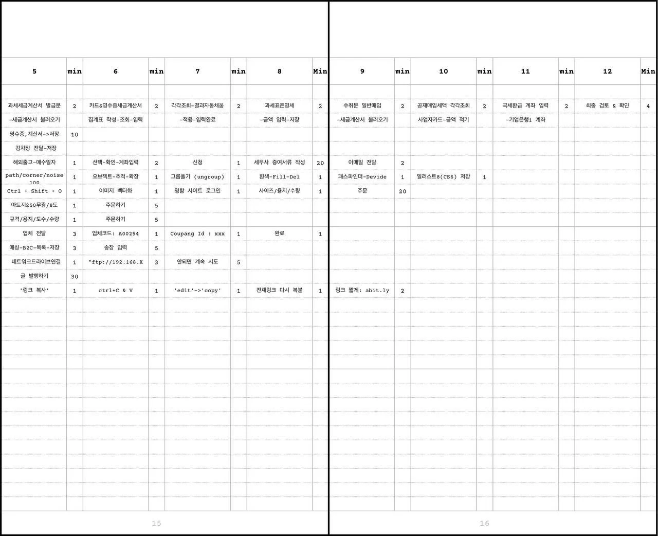 실제 수행 기록: 과업을 실행하면서 단계별로 내용을 기록하고, 실제 소요된 시간을 적는다.